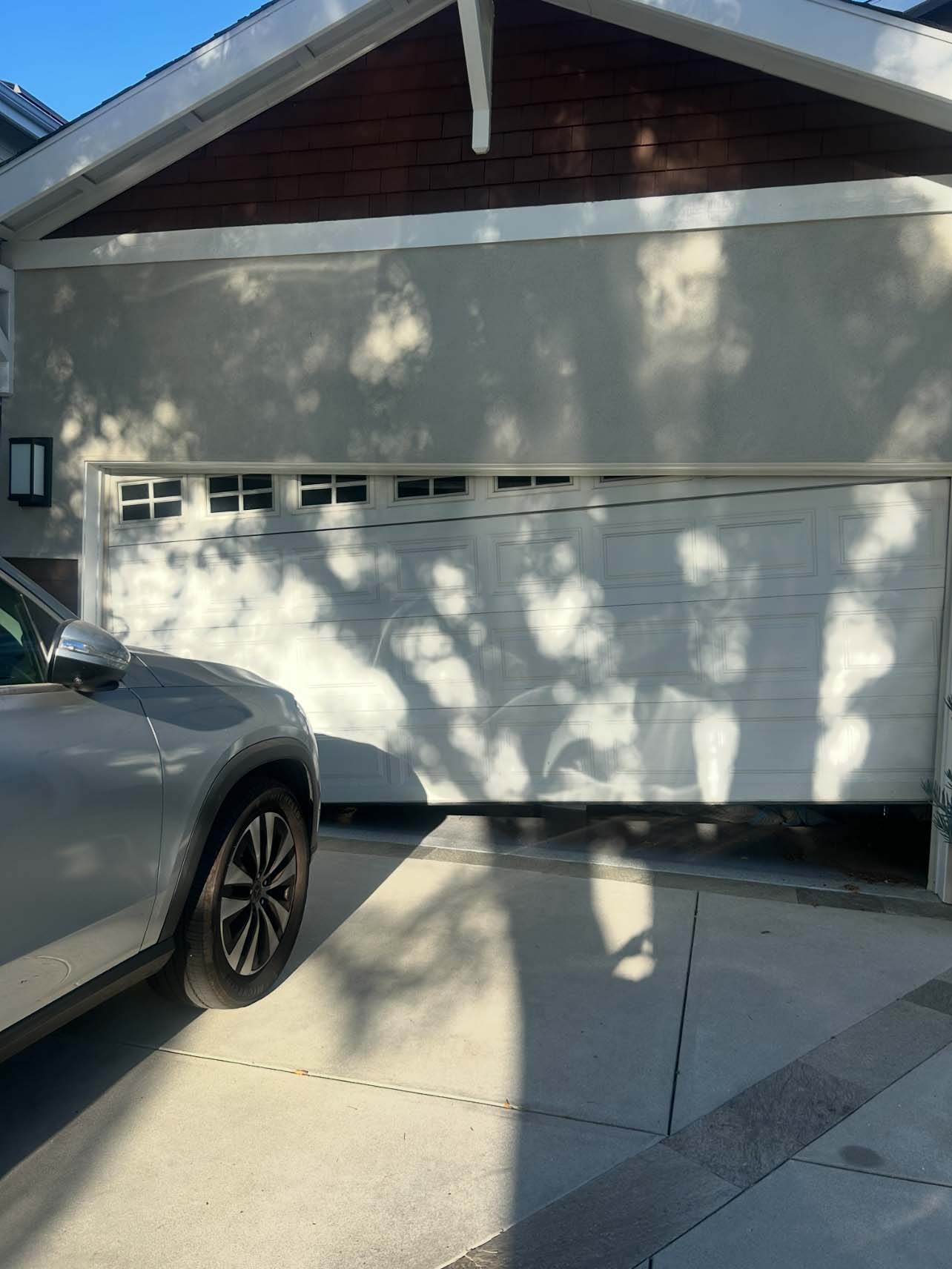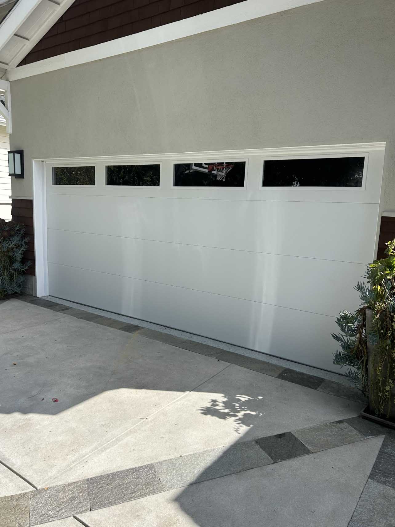 Project description: When we showed up, the clients garage door was extremely damaged and after further assessment, it needed to be replaced. The client chose to go with a new flush texture door with windows from CHI and it came out beautifully