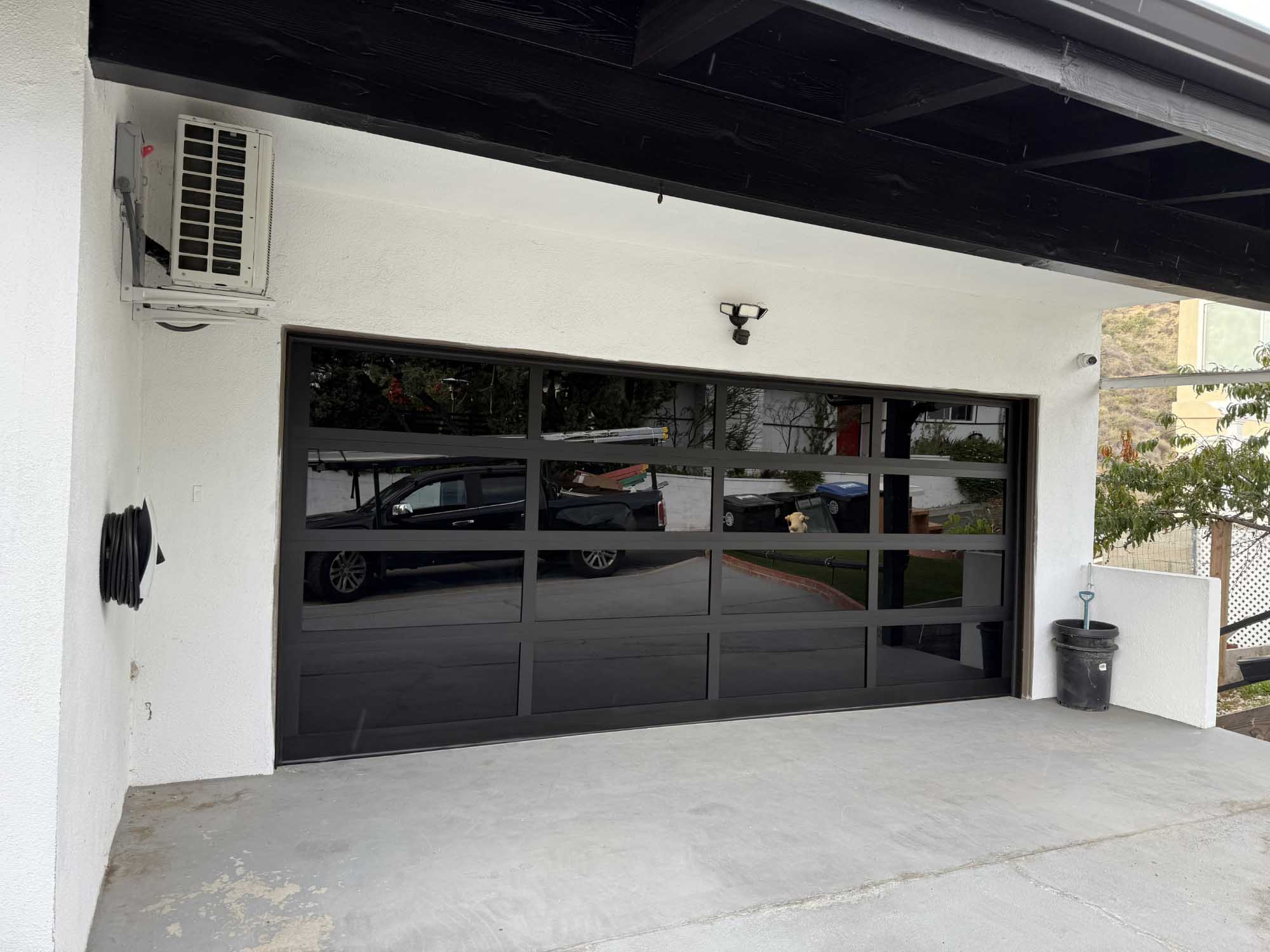 Project description: For this project, we installed a brand-new full-view modern garage door in a sleek black-on-black finish. The customer wanted a door that would completely transform the look of their home while providing durability and smooth functionality. We removed the old system, prepared the opening, and installed the new aluminum frame with tempered glass panels, ensuring perfect alignment and balance. The final result is a bold, contemporary garage door that enhances curb appeal, allows natural light in, and operates with